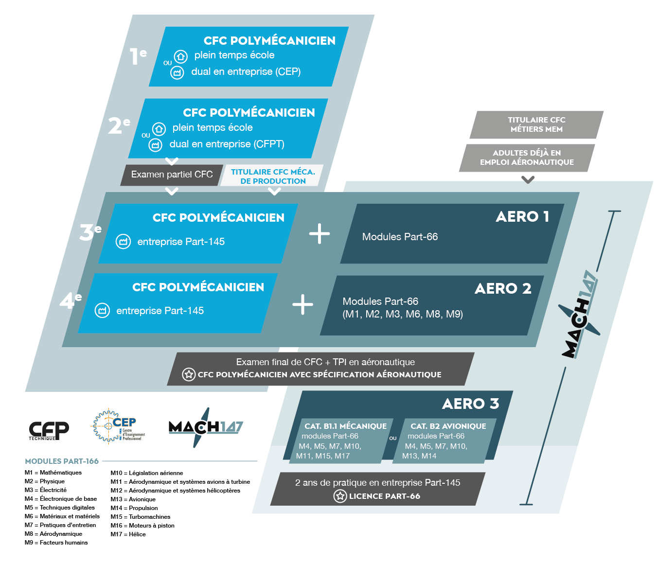 1 Les modules aéronautiques AERO 1 sont suivis en parallèle du CFC de polymécanicien en filière duale. A la fin de cette année, le candidat passe l’examen partiel de polymécanicien.